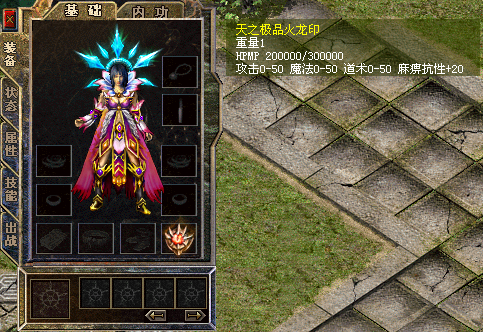 玩家装备天之极品火龙印,自身或英雄攻击、魔法、道术上限增加50点,天之极品火龙印自身具备麻痹抗性+20,天之极品火龙印的持久度用魔血石来维持,同时发挥魔血石作用;