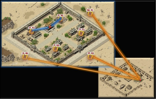传送——当一个行会占领了开阳、玉衡或摇光据点的时候,行会成员可以从盟重安全区的NPC据点传送员直接传送至该据点周围;当一个行会占领了天枢或天权据点的时候,行会成员可以从该据点传送至皇宫。