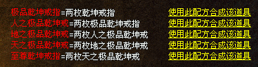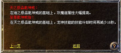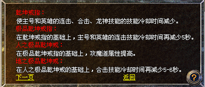 乾坤戒指,佩戴等级300级,主号或英雄都可佩戴。主号佩戴乾坤戒指后的连击技能、甚至龙神技能(十步一杀、天雷乱舞、怒噬回天)的技能冷却时间都将缩短;英雄佩戴乾坤戒指后,英雄的连击技能、合击技能的技能冷却时间也会随之缩短。