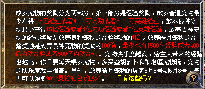 不过,如果有玩家领取但忘记放养宠物,本活动也会给他们最基础的经验或内功经验或英雄经验的奖励。
