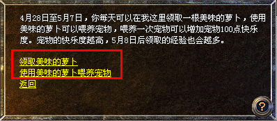6、玩家可将领取到的宠物放到苍月岛上喂养,不论你是否在线,宠物都会在活动期间(4月28日至5月7日)为玩家积累大量经验、内功经验或英雄经验。不过,如果玩家在这段时间内精心照顾宠物,提高它们的快乐度,就会在活动结束后获得更加高额的经验!玩家可用美味的萝卜来喂养宠物,每喂养宠物1次会增加100点宠物快乐度。也可以用胡萝卜逗宠物玩,这些都可以提高宠物的快乐度。除此之外,玩家还可使用鞭炮逗宠物,这虽然会减少宠物的快乐度1点,但使用鞭炮的玩家也可以获得高额经验和内功经验,甚至是88灵符礼包或者卷轴碎片