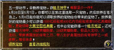 4月28日至5月7日,1-140区(百区除外)满61级的玛法勇士,都可以在盟重兔财神处选择一只宠物领取,然后将其放养在苍月岛上。宠物有:普通宠物、良种宠物、吉祥宠物、皓月宠物四种,根据不同种类的宠物,所获得奖励也各不相同。