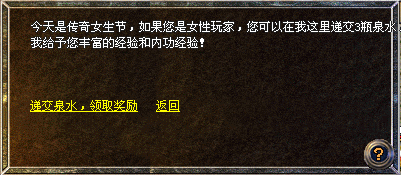 热血传奇的女性玩家前往兔年狂欢使者处递交3瓶泉水,即可获得丰富的经验和内功经验。