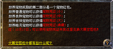 2、根据放养不同种类的宠物获得相应凭证,然后使用凭证兑换大展宏图包,开启后可获得海量经验以及多种奖励。