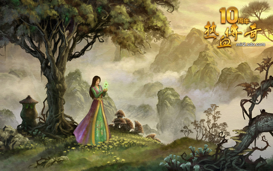 神秘的少女站在山峰之上,背后的千年古树闪耀着奇幻的光芒,远处的群山巍巍耸立,苍松翠柏营造出一片环境天堂。10年了,对于所有的传奇人来说,《热血传奇》就是一片永恒的精神家园。