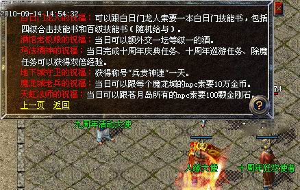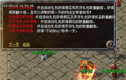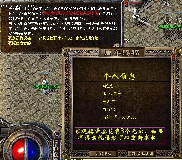 9月15日起,只需花费3元宝或者通过做任务获得赐福令牌,即可至盟重狂欢使者处来求取祝福(完成除魔任务、十周年巡游任务、庆典任务都有机会获得赐福令牌)。