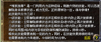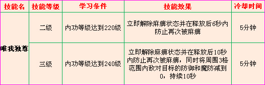 “唯我独尊”技能是一种利用内力运转经络,刺激穴窍的技能,它可以迅速解除身体的麻痹状态,并在一段时间内防止再次被麻痹,有了此技能,真正是神功一出,号令天下,唯我独尊!