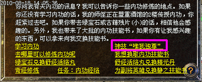 二级唯我独尊:玩家或英雄内功等级达到220级后,可于9月29日前在盟重NPC:内功宗师处为主号或英雄领取“唯我独尊第二卷”