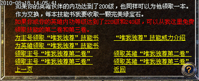 三级唯我独尊:玩家或英雄内功等级达到240级后,可于9月29日前在盟重NPC:内功宗师处为主号或英雄领取“唯我独尊第三卷”;