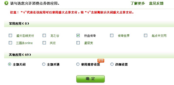 认证通过后您即可设置您通行证下所有游戏的点券消费功能,如下图设置即可保证您的元宝仅可在热血传奇使用。