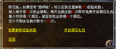 9月16日起,1-140(百区除外)拥有恩师帖的玩家可前往庄园管家处,递交恩师帖换取诸多奖励,每人每天有20次机会换取。每天兑换达到20次即可免费开启烟花礼包,最少可获得1个烟花,更有机会获得99个烟花大奖!