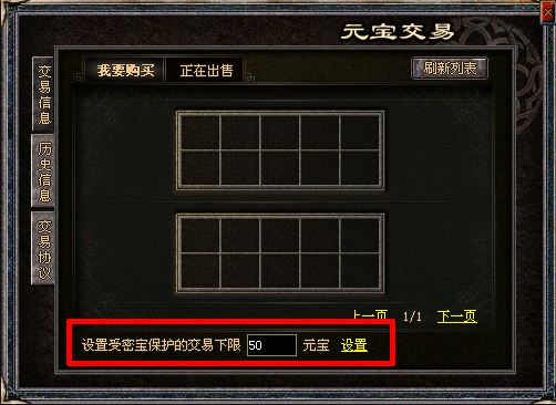 1、单笔交易上限保护:单笔交易超过玩家自行设置的上限,则要求输入密宝验证。修改单笔交易上限时需要输入密宝。初始的单笔交易上限为100元宝。上限设置为0元宝时,为无上限。