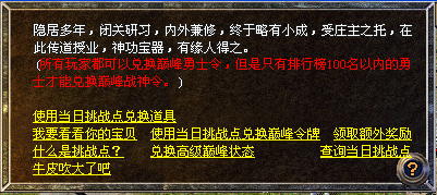 1月17日起,玛法勇士们凭借挑战点不仅可以前往绝世高手处兑换巅峰勇士令(排行榜100名以内的勇士可兑换巅峰战神令),让自己具备超乎寻常的神奇力量,还能凭借挑战点兑换英雄经络丸、奇经培元丹、斗转灵丹、英雄圣水等多种道具!