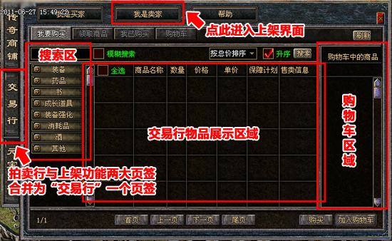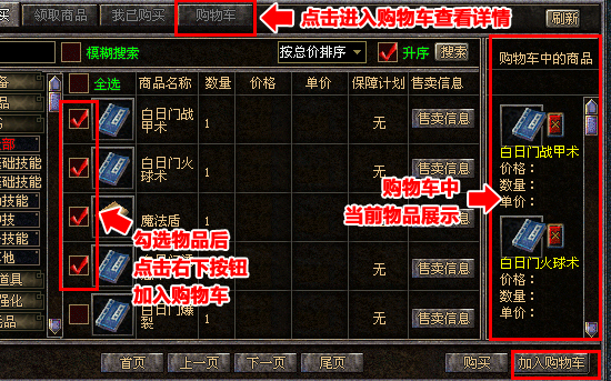 装备、武器、药水、卷轴,面对琳琅满目的商品,您是否会觉得这好那好样样想买。没关系,新版交易行增加的“购物车”功能,让你买东西同样省心省力。在浏览商品,但未决定购买时,您可以勾选商品,将其放入“购物车”,与其他中意的商品进行仔细的比较后再行决定。此外,有了“购物车”后,您也可以通过购物车界面来实现所有购物车内商品的一键购买——轻松点击一下鼠标,海量宝贝尽入您毂中!目前,购物车中最多存放六件待决定商品。