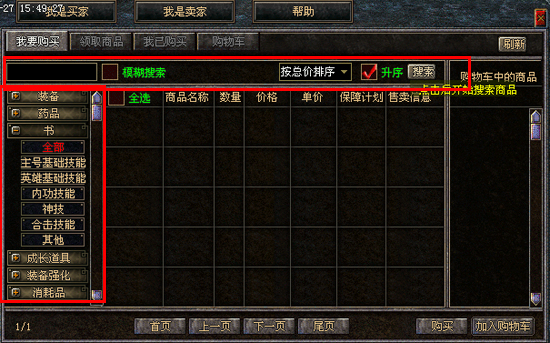 为了让广大玩家在越来越多的商品中能尽快找到自己所需,新版交易行中对搜索功能同样进行了优化。在商品展示界面的左侧,有“装备”、“药品”、“书”、“装备强化”等八大类别的商品,选择相应的商品分类后点击“搜索”按钮即列出所需的商品;此外,还可以设定的装备分级,筛选出适当的装备。