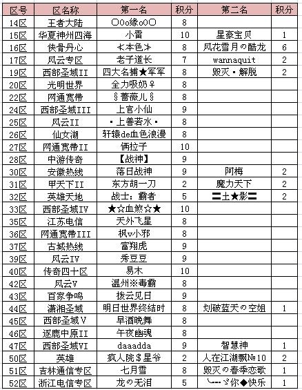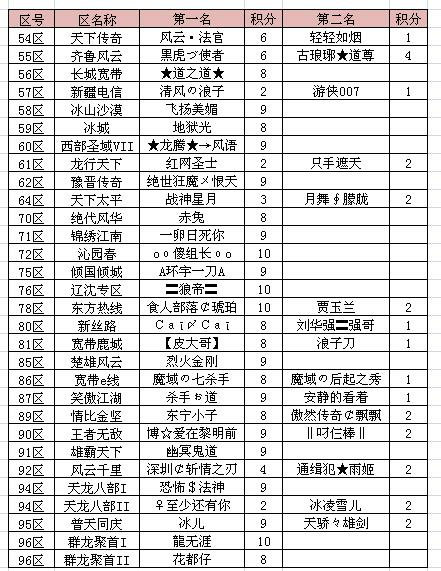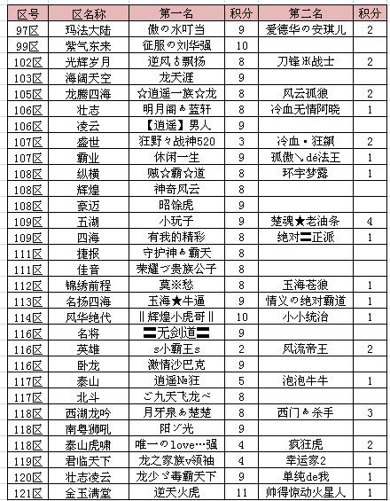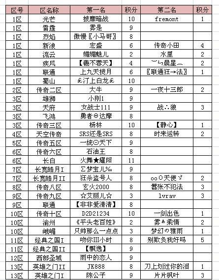 截止8月12日早上9点,目前各区服获得积分赛第一名以及第二名的玩家名单如下: