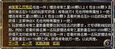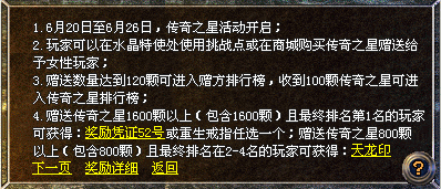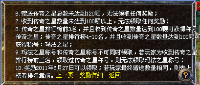 4、 如赠送传奇之星总数未达到120颗,无法领取任何奖励,如收到传奇之星总数未达到100颗以上,无法领取任何奖励。