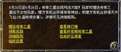 赠送传奇之星的玩家和接到传奇之星馈赠的女性玩家,若积累一定数量,将会出现在水晶特使的排行榜上!