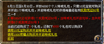 1、玩家只需10元宝就可购买1个特戒礼包,开启特戒礼包就能获得海量经验和奖励凭证60号其中之一。