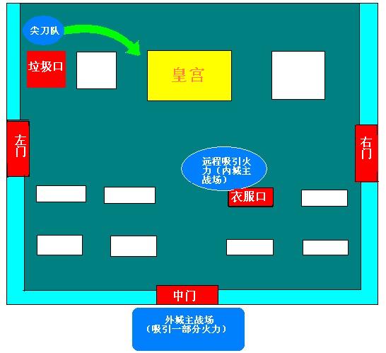 2、 远程攻击职业从衣服口进入,在衣服口群攻,吸引城内大部分火力。
