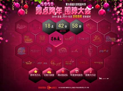 在这个欢庆的节日里,我们为大家精心准备的第35届盛大游戏嘉年华,将在2010年12月25日至2011年1月3日,共计10天的时间里举行一场盛大的游戏微博狂欢派对,我们与大家一起蹲点跨年,共开围脖大会!