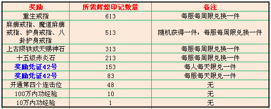 集辉煌印记,兑重生戒指、麻痹戒指、魔道麻痹戒指、护身戒指,八卦护身戒指等极品装备!还可使用新奖励凭证42号兑换四大特戒!